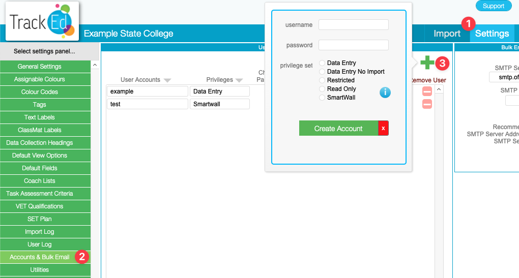 User accounts are added on the ‘Settings > Accounts and Bulk Email’ page inside TrackEd. Any account holder at your school with data entry access can add and edit the accounts list.