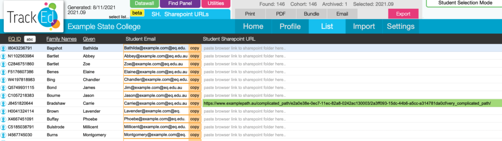 As an optional next step, you can open each student folder in Sharepoint, and copy the browser URL back to TrackEd using the list page called ’Sharepoint URLs’. As the link is pasted TrackEd to creates a QR code for each path